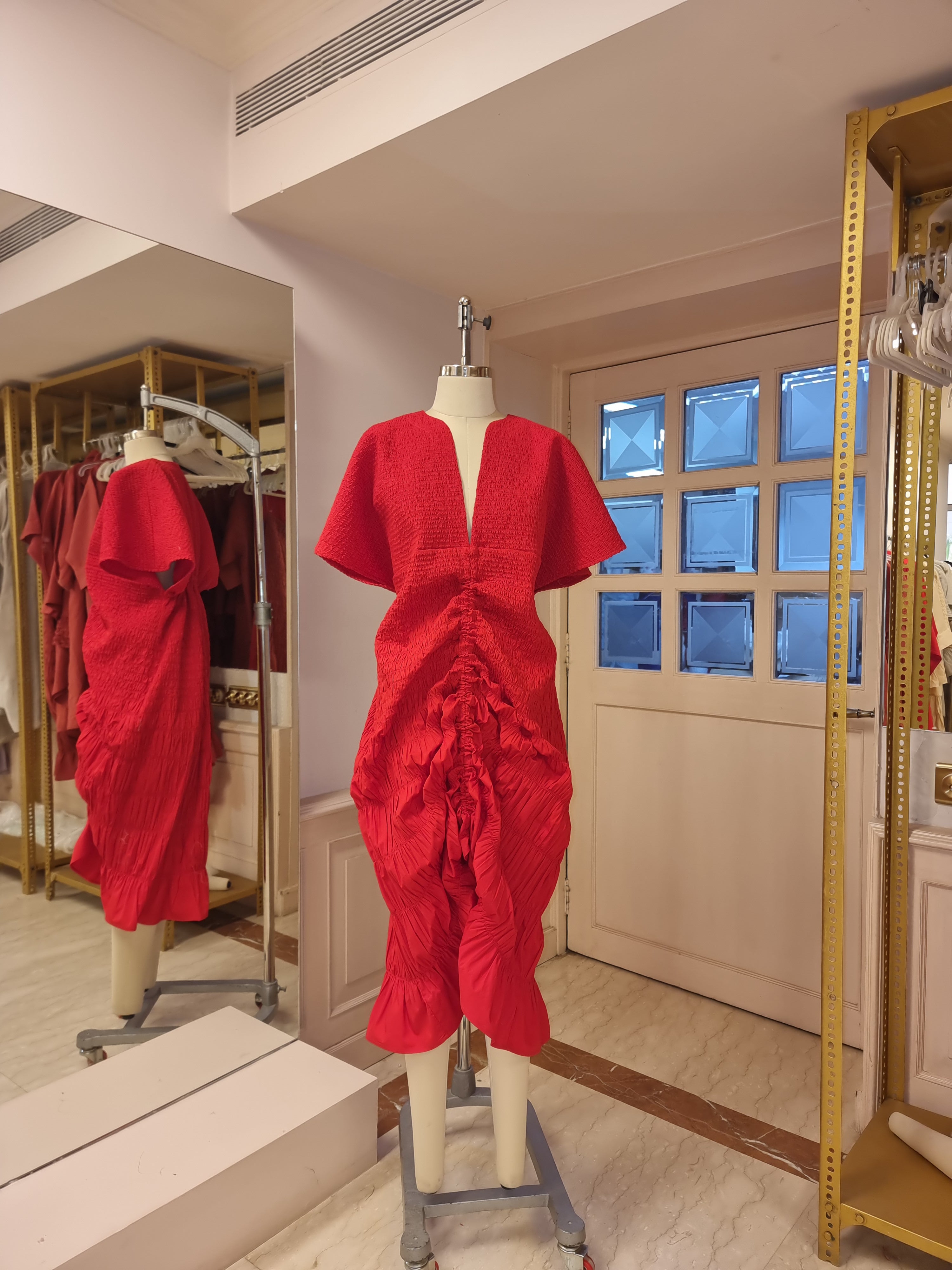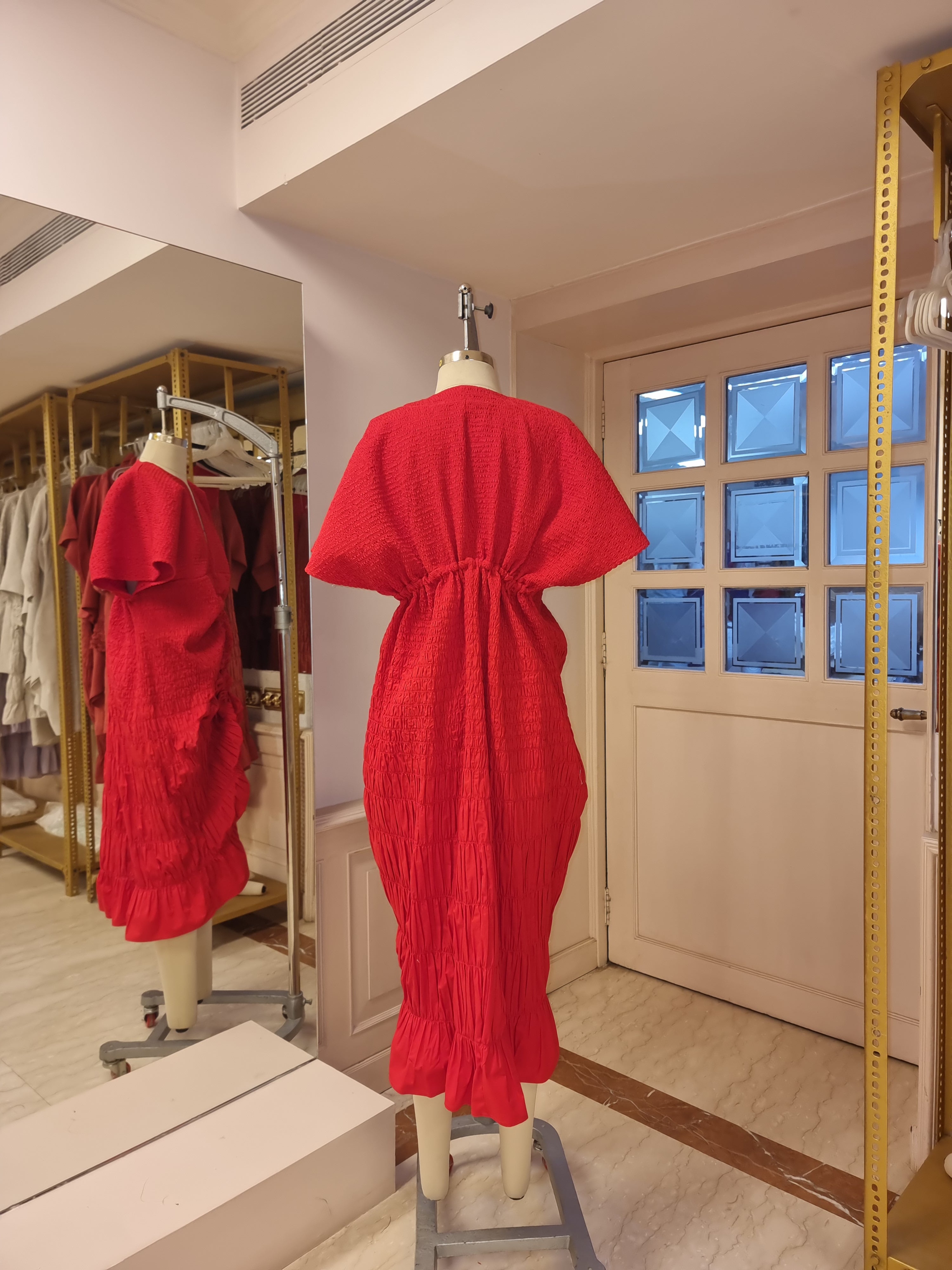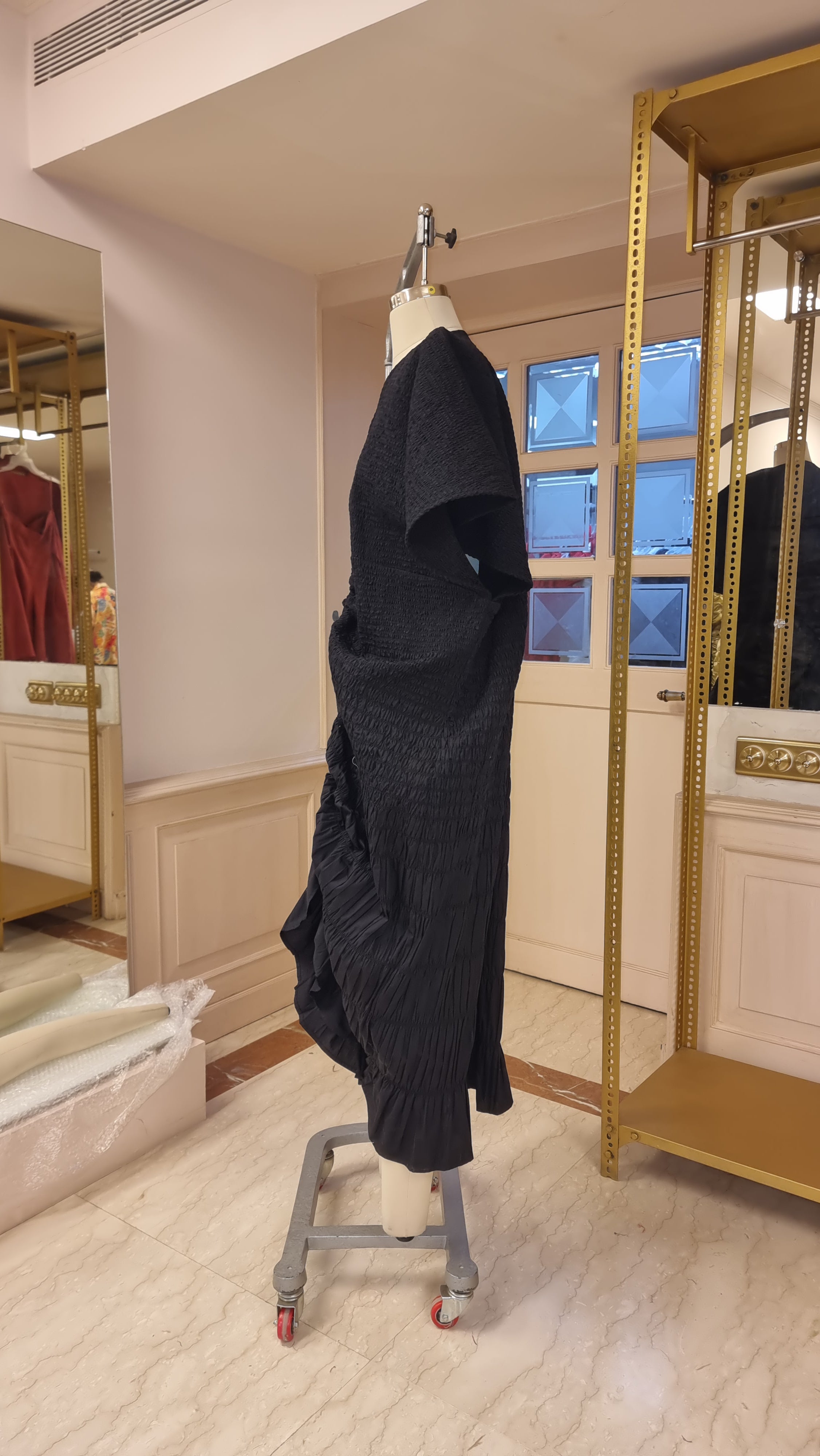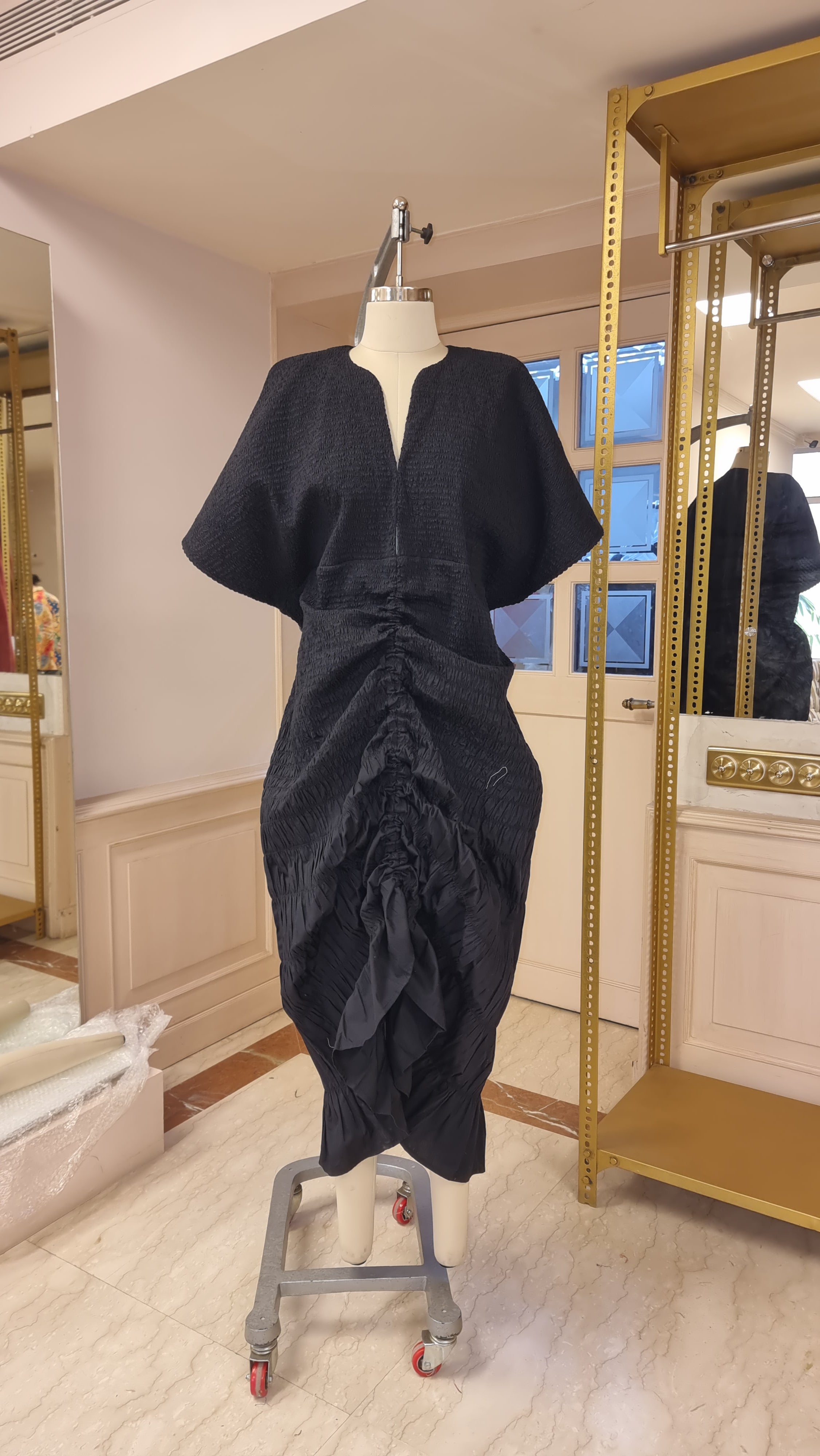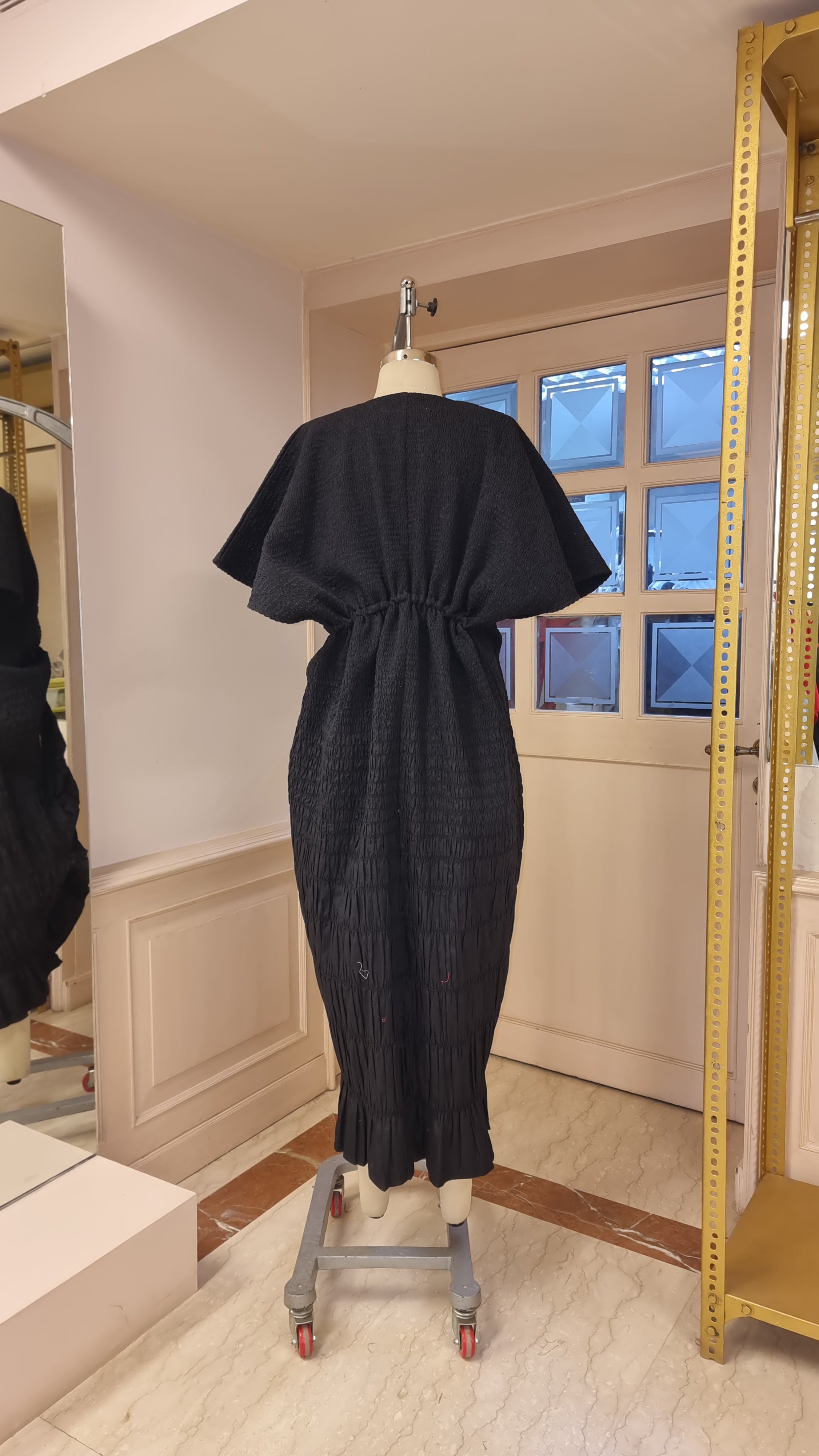 The piece was sculptural and functional - the adjustable double drawstring kaftan dress could be adjusted from the back spine to create a beautiful fan like gather, and from the front spine - it drew eyes down to the feet, making her a live sculpture. Every time she moved the fabric, ripples, gathers moved with her presenting herself anew.