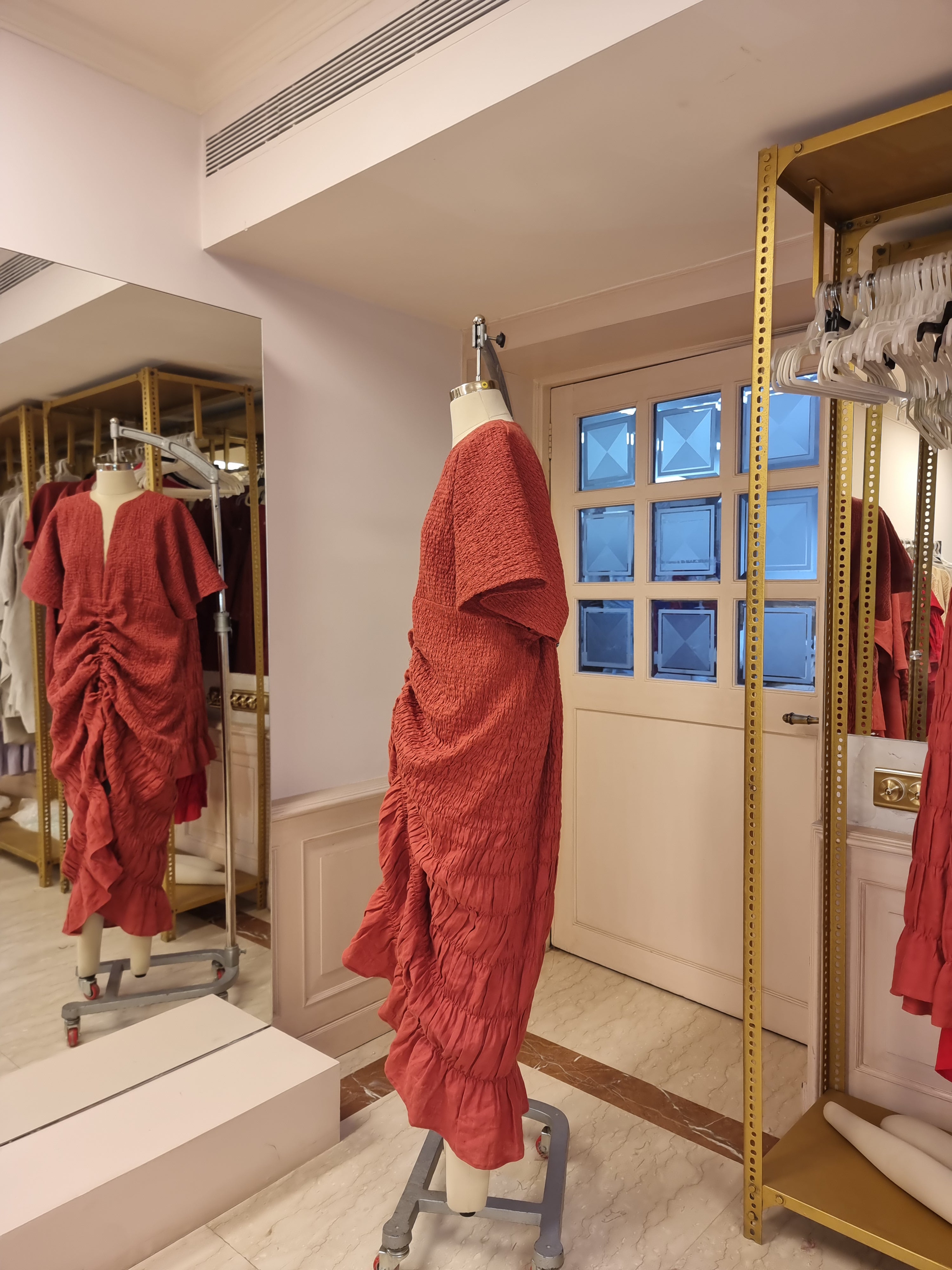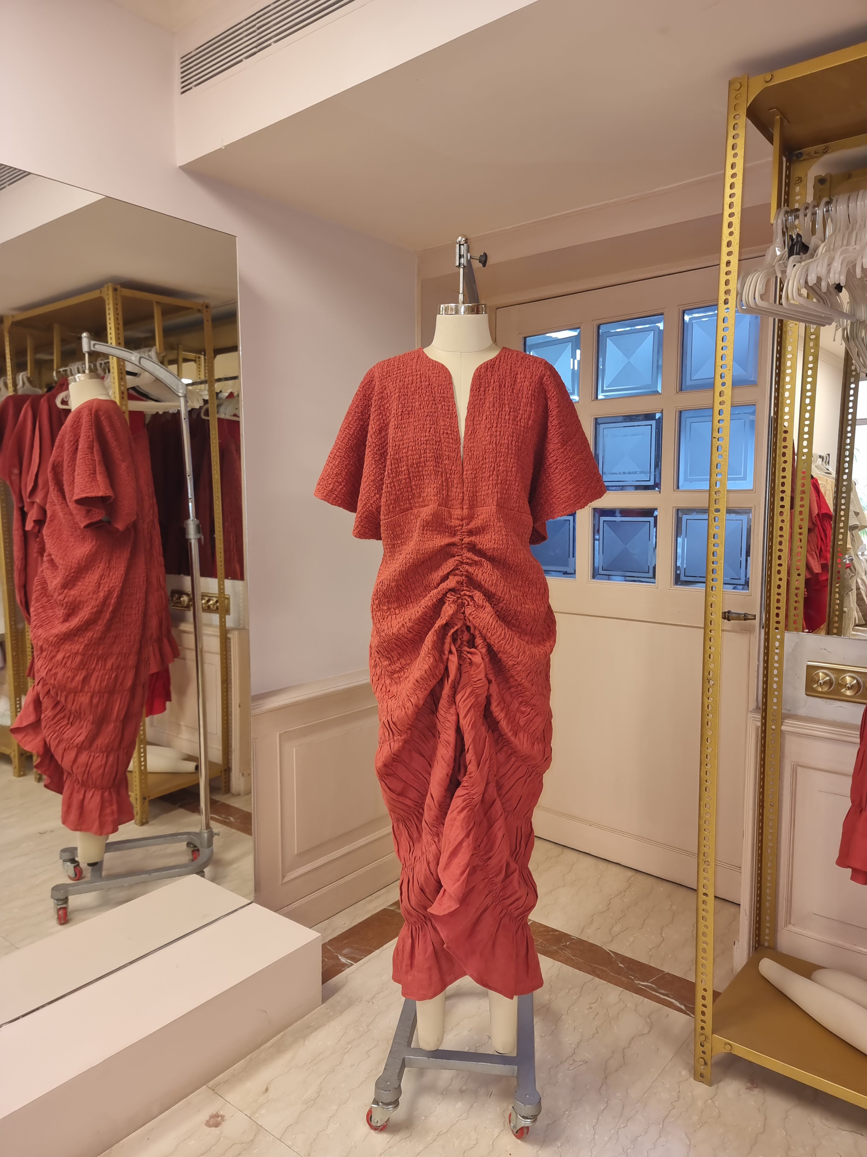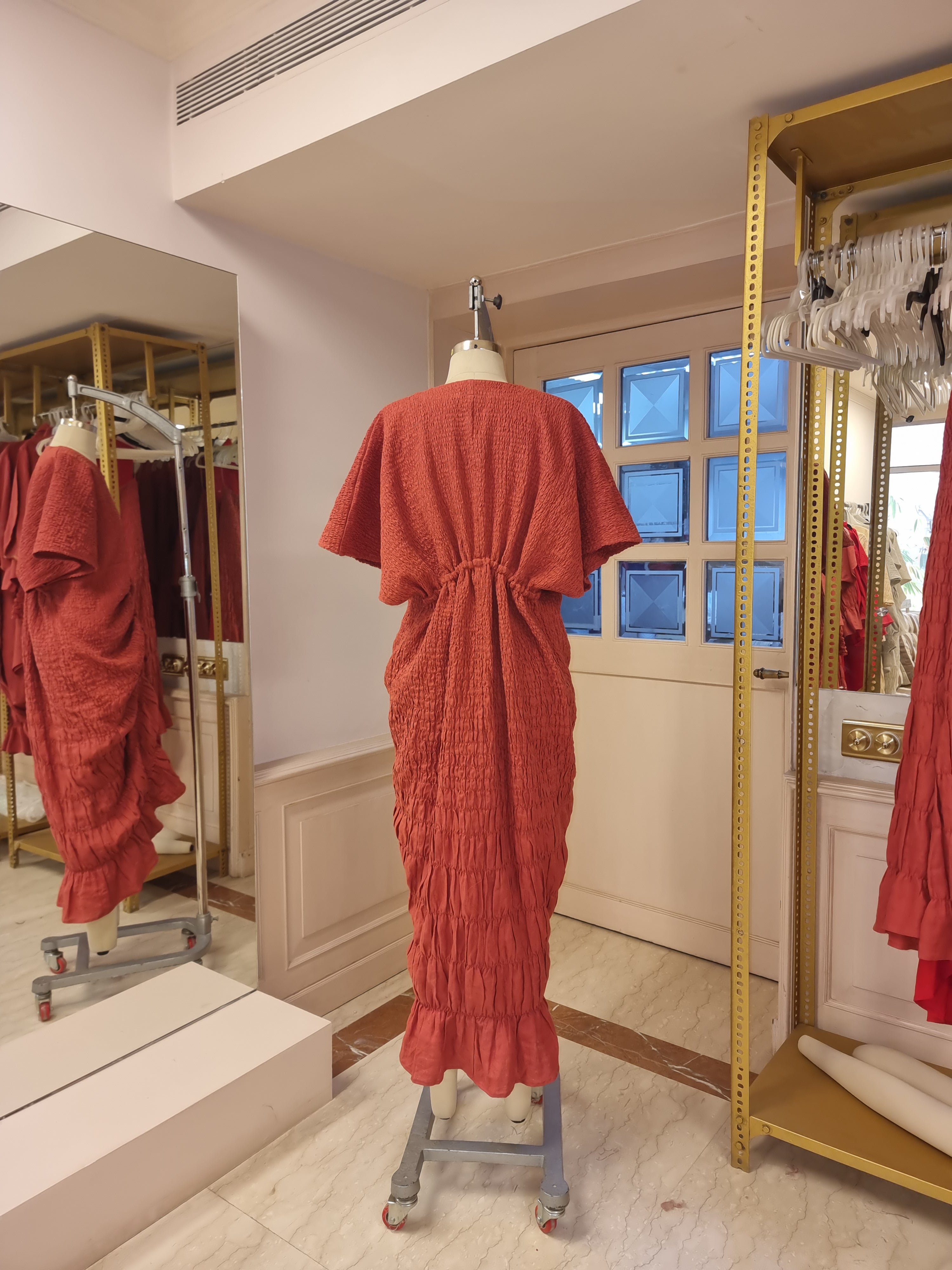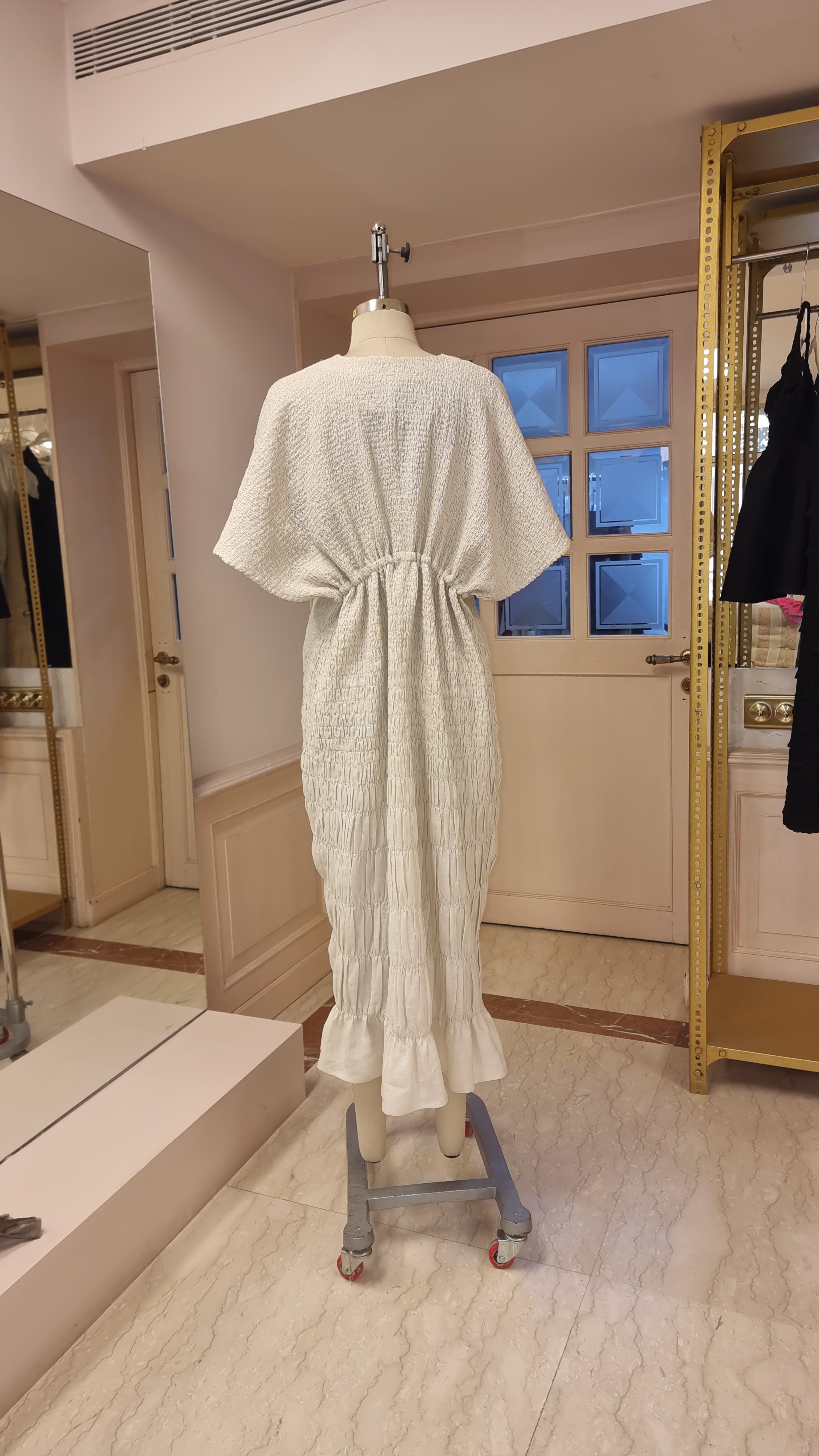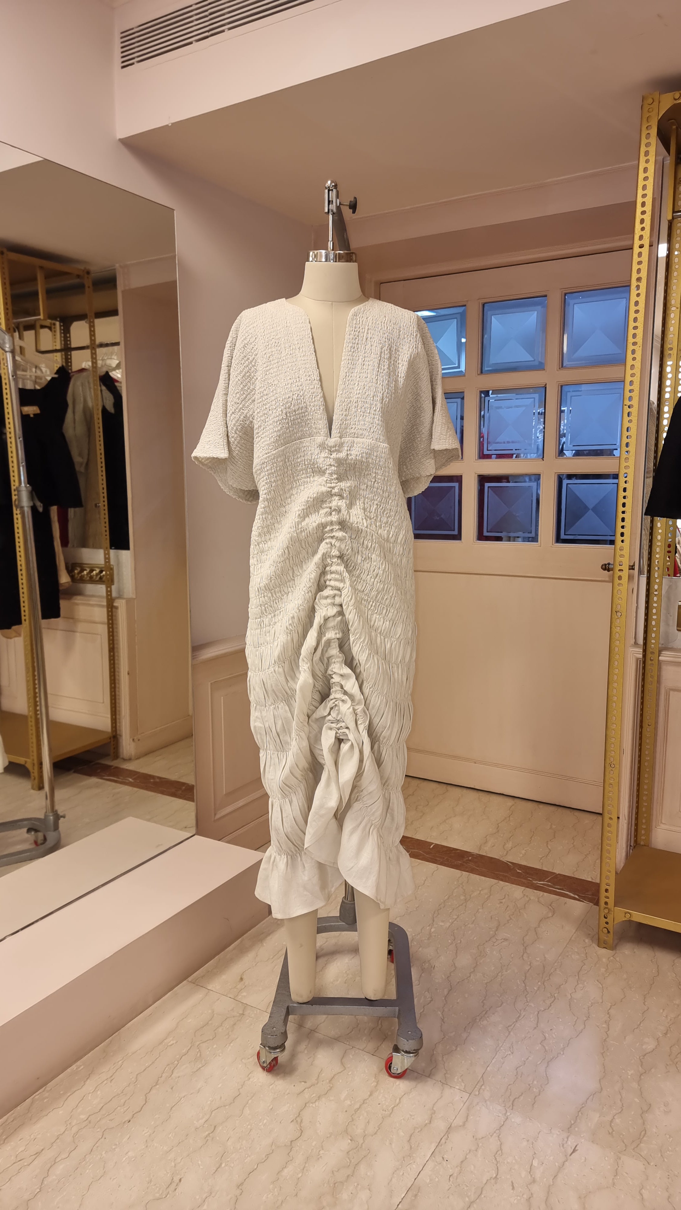 The piece was sculptural and functional - the adjustable double drawstring kaftan dress could be adjusted from the back spine to create a beautiful fan like gather, and from the front spine - it drew eyes down to the feet, making her a live sculpture. Every time she moved the fabric, ripples, gathers moved with her presenting herself anew.