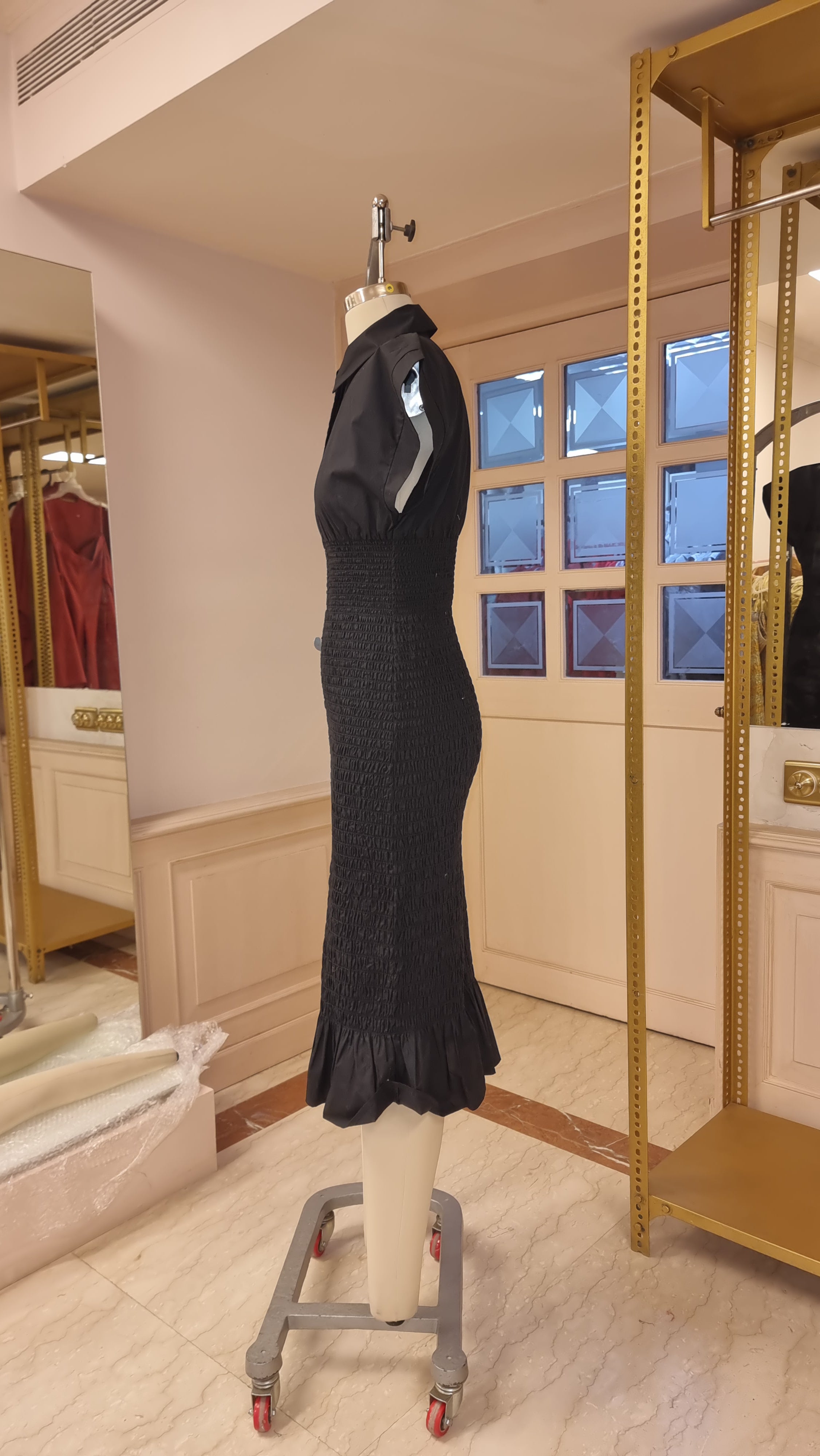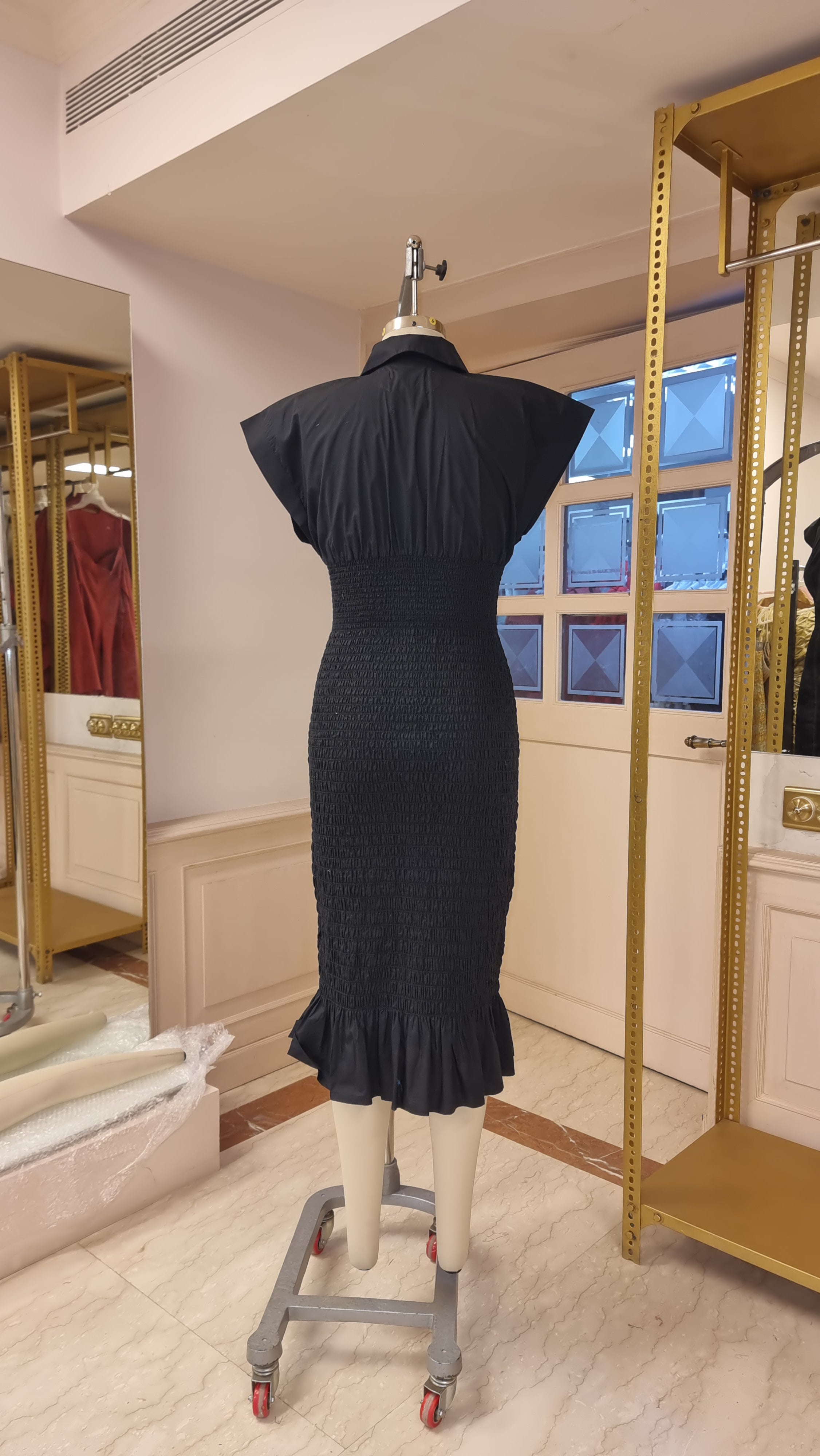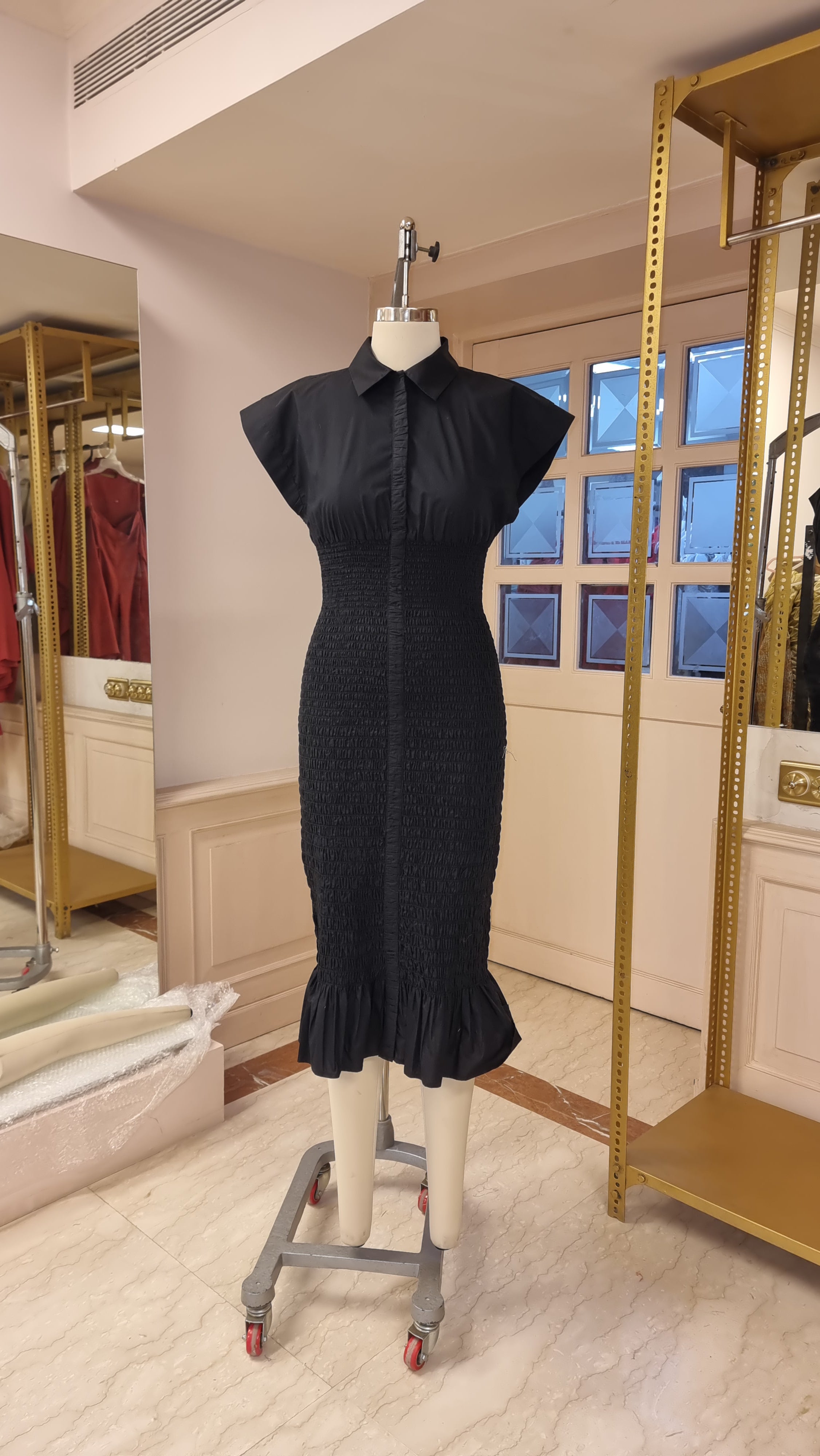 Winged shirt inspired fitted dress with signature scaled line smocking featuring false placket